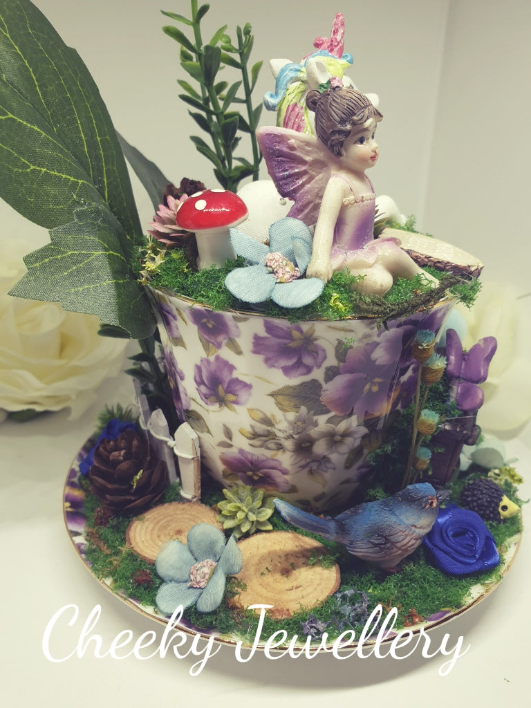 Gorgeous fairy garden theme in a decorative style ceramic teacup and saucer, succulents, pink and purple flowers, roses. Approx 11.5cm x 13cm