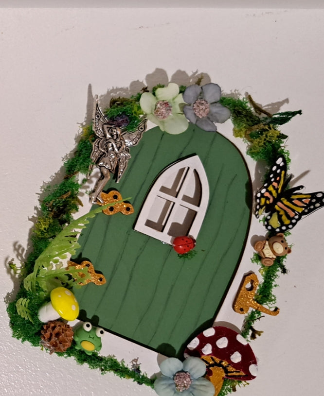 Hanging handpainted wooden fairy door detailed with:
