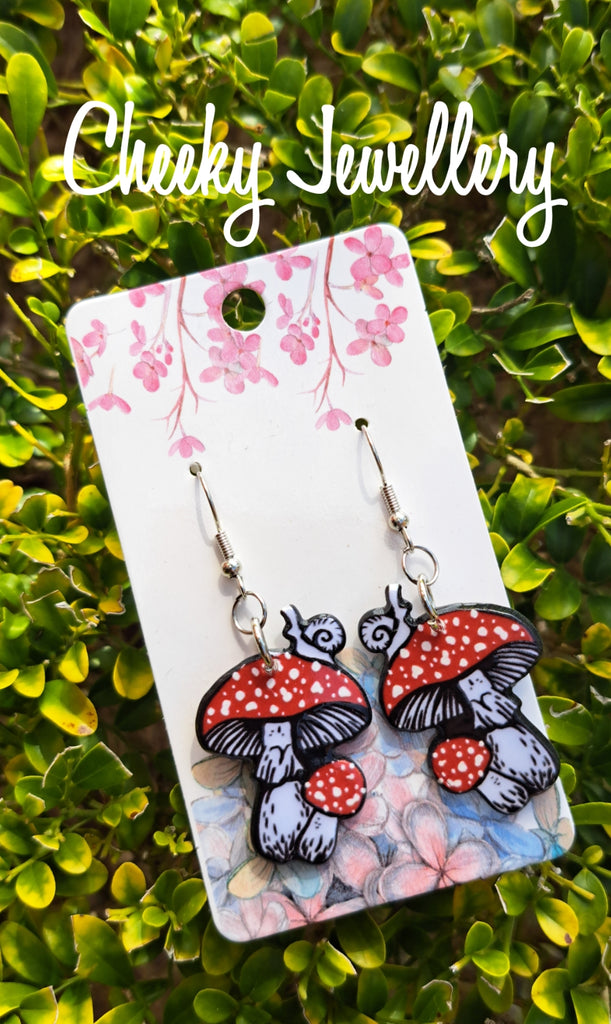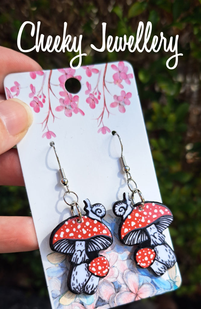 Toadstool mushrrom earrings, all so cute. Resin earrings, dangly earrings. Light weight.